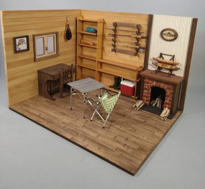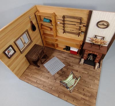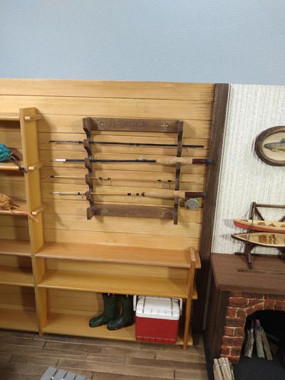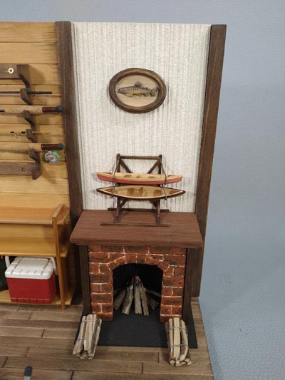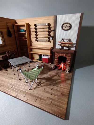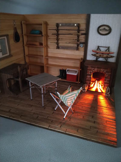ログハウス風のアウトドア仕様の ドールハウスを作ってみました 暖炉の上にはカナディアンカヌーの ミニチュア模型にヤマメのレリーフ 壁掛けのロッドにランディングネット ロールテーブルにガタバウトチェアも 配置してみました