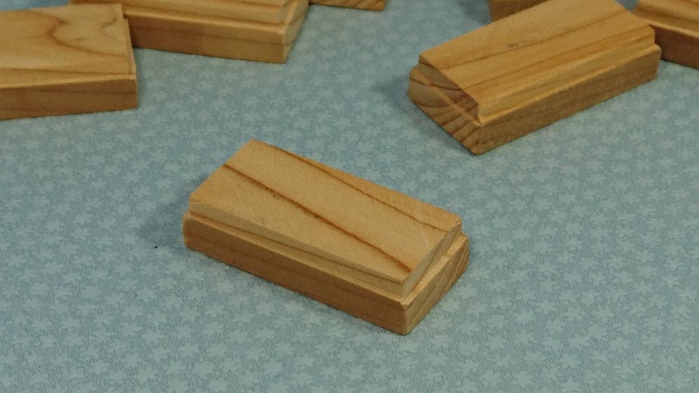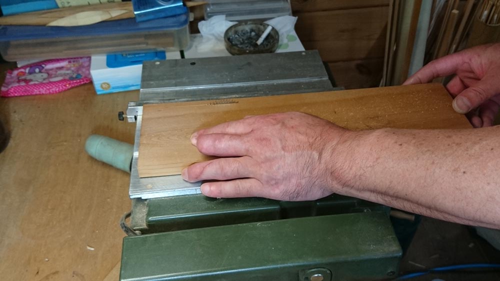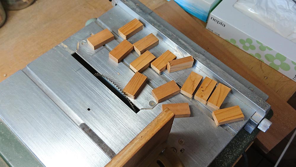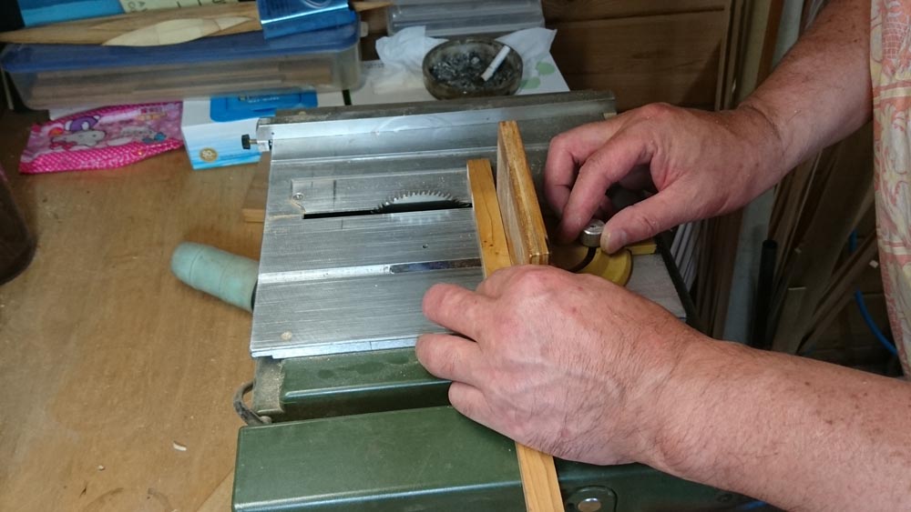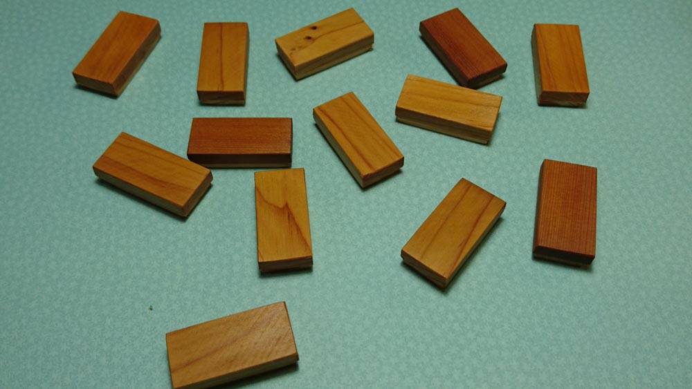 切断したイチイ材をポリウレタンニス透明で塗装する |
