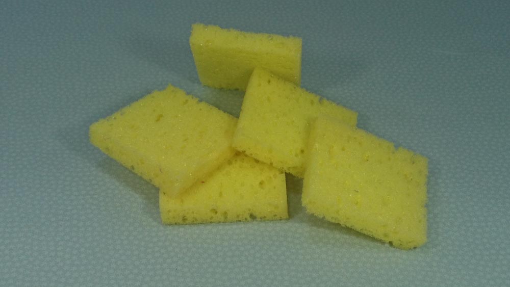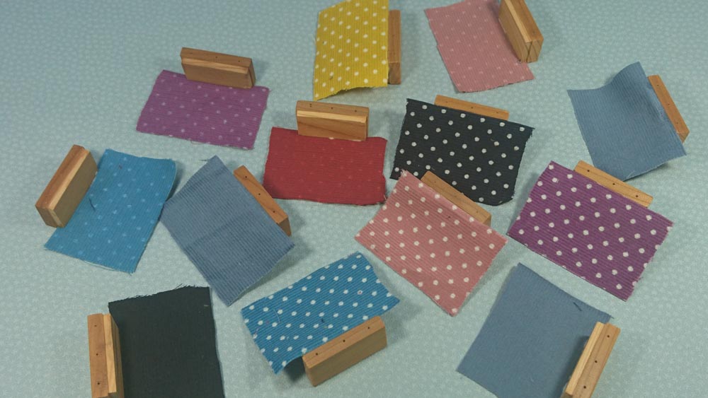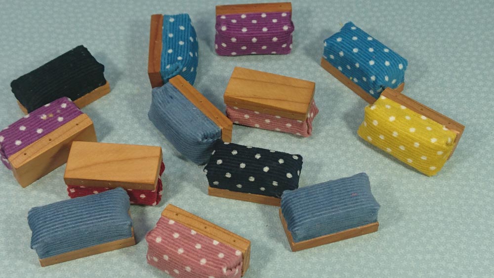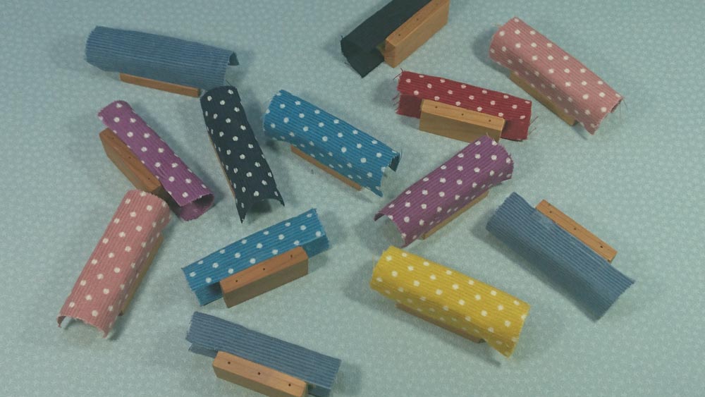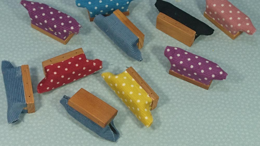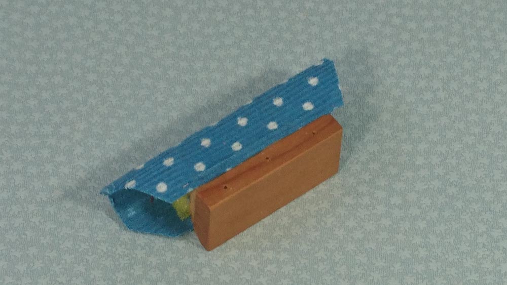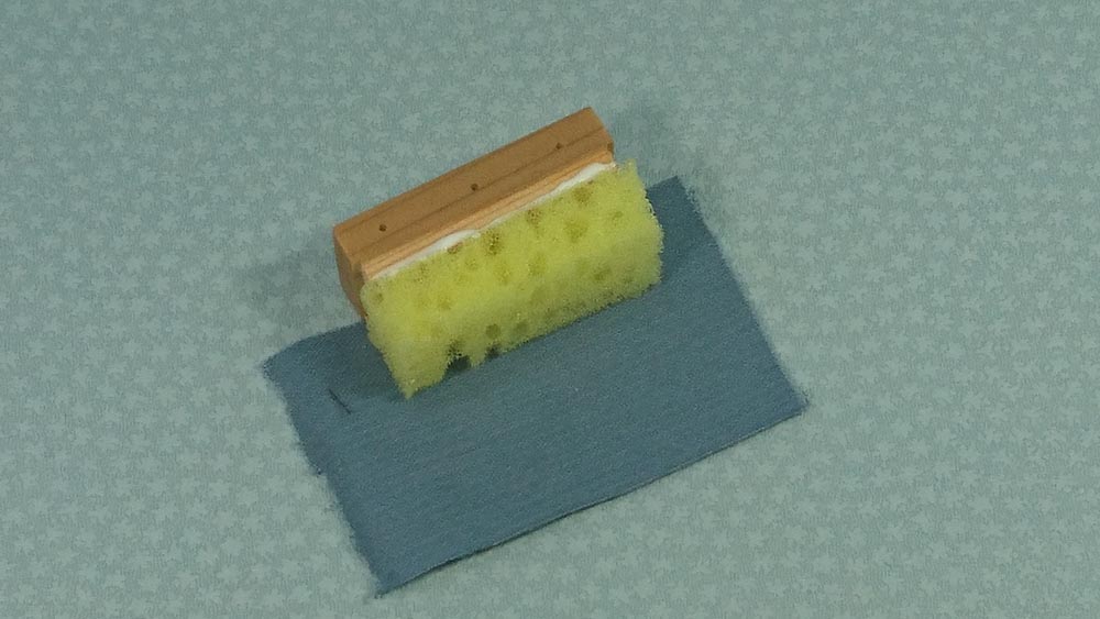 スポンジを少し押し込む様にテンションを加えて布地を貼る |
