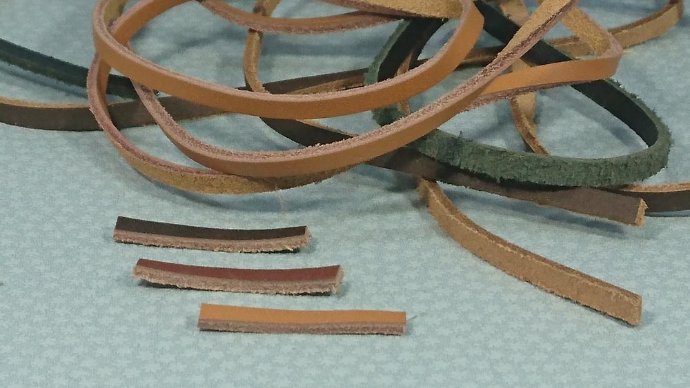 真鍮釘で革ひもを取り付け、回りの飾り釘も打ち込む |