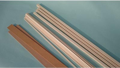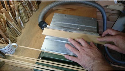 ストリップボードとは、カヌー本体(ハル)となる材料の事 ヒノキに加え、厚さ5oのアガチスを2o厚になるように テーブルソーで裂いて2o×5oのストリップボードを作る