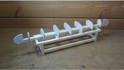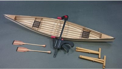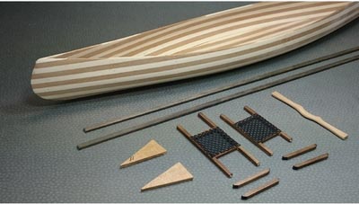 カヌー本体に防舷材、デッキ、シート、スオートを取付ける 実際のカナディアンカヌーは船体表面をガラスクロスとポリ エステル樹脂でFRP加工をするのだがミニチュア模型なので ポリウレタンニス(クリア)を塗装して仕上げる |
