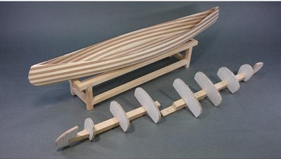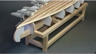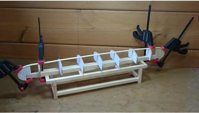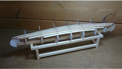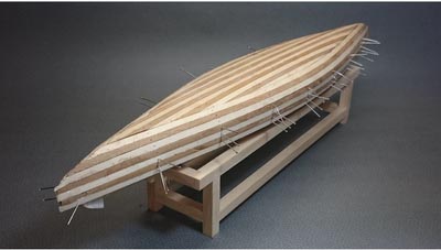 フットボールラインに沿って底板をカットし、側板を張り 始める 底板から側板の切り替えは、更にカーブがきつくなるので 虫ピンとクリップで固定して、左右交互に貼り進める 1日の作業の終わりは、左右が同数のストリップボードと なるようにする これは製作中に基準となるモールドが歪まないためだ |