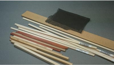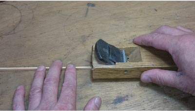 初めにフォームのセンター沿ってエッジ加工していないスト リップボード(ヒノキ)を1本取り付ける 通常はフォームにタッカーを使ってボードを固定していくの だが、ミニチュアサイズなので、虫ピンで代用して固定する 通常はエポキシ系の接着剤を使うのだが、木工ボンドを使用 |