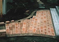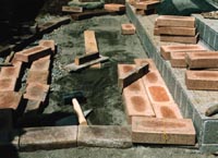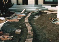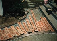水糸を張り縁石となるレンガ を並べてモルタルで固定する 直線ではなく、自然なカーブ を造ってみた。 |