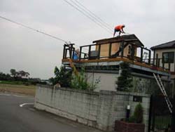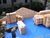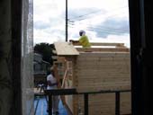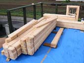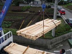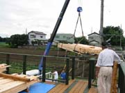 | 知り合いのユニック車を借り出し、ログハウスの部材を吊り上げてデッキの上に荷揚げしていく! |