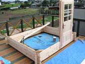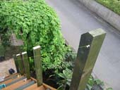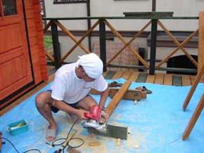 残っていた手摺り柱の間に2×4材を バッテンに格子に組んでいく 柱や手摺りがねじれたり、そったりして いるので、1本ずつ寸法取りして 切り刻んでいく、手間の掛かる作業だ! |