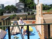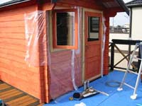 | 屋根の資材材のルーフィングを貼り、何とか格好がついてきた。両サイドに板金加工したトタン板を取り付ける。 |