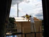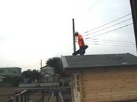 | 慣れてきたのか、屋根の上を所狭しと動き回る | 屋根のトップに板金板の取り付け |