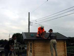 何とか、屋根の作業が終わる頃には雨が降り出してきた。何とか間に合った!! 本日の作業はここまで・・・・ |