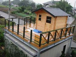 最後まで残っていた階段も取り付き 何とか格好がついた 制作開始からすでに4ヶ月が過ぎた・・・・ 続いてはログハウス内の作業に移る 屋内配線、照明器具、エアコン、床、天井、 塗装・・・ まだ、やることは沢山ありそうだ!!! |