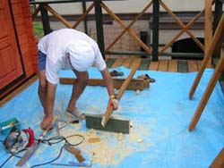 | 屋根材を梁にビス止めしていく | 夕方から雨の予報なのだ | 屋根の下地材を貼り終える |