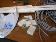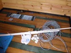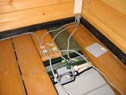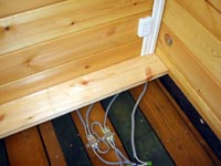 | ケーブルは床下で処理、 壁に出てくるケーブルは 全てモールで処理した。 外での作業のため外壁 には防水コンセントを1個 所追加した。 |
