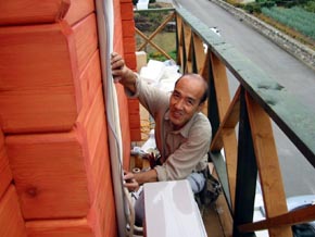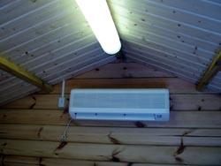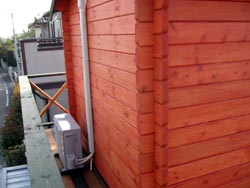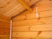 | ログハウスの屋内配線はエアコン用と 一般コンセント用の2回路を用意した。 エアコン用コンセントは単独回路で Fケーブル2.0mmを使用 一般コンセント用は1.6oを使用し、 壁用2口コンセントを3個所 照明器具用スイッチ1個所を配線工事した。 |