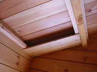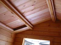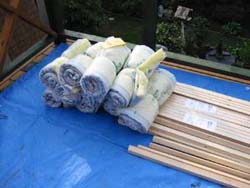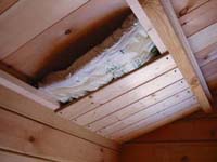 | 天井の梁に垂木を抱かせて下地にする | 壁材の要領で天井を張っていく。 | 間に断熱材を挟み込んでいく |