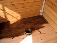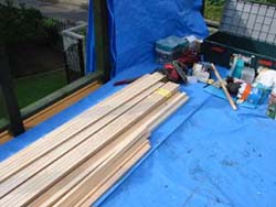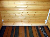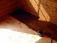 | 壁の配線部分を欠き込み張り始め | 四隅にコンセントとスイッチの配線がある | フロアー釘#15×38とボンドを併用で固定 |