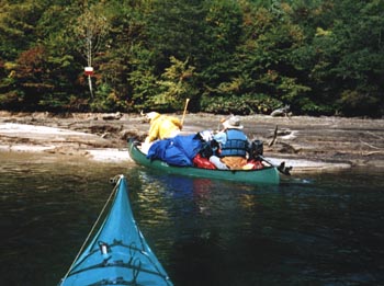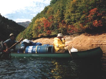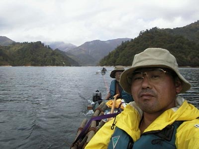 10月13日(金) 途中でキノコの買い出しを済ませ、矢木沢ダム奥利根湖に10時に到着した 紅葉にはまだ早いが葉が色づき始めている、貯水率は80%程あり今年の雨の多さを伺わせる 道路の舗装も着々と進行ししつあり、出艇場所まで完全舗装されているのにはビックリした すぐ後から来た南雲さんのカナディアンに、今回の目玉となるドラム缶風呂とキャンプ道具を 積み込み、11時に出艇・・・と思ったら、新潟から参加の三条のイカちゃん登場!先に出発する |