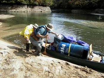 町役人南雲、サメカジ寒河江、発熱体飯田の3名は、今回目的地の左側のコツナギ沢を目指す 今回はキャンプ道具に加え、ドラム缶があるので南雲さんがカナディアンと船外機を用意した コツナギ沢上陸、11時30分・・・・これからが足場の悪い中の荷揚げとなる・・・・ |