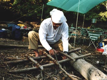テント、タープを張り、テーブルを広げ、第1段階のキャンプ設営を完了して、軽い昼食をとる 続いてドラム缶風呂の設置に取りかかる、出入りをするための梯子を作り、見事?完成!! |
