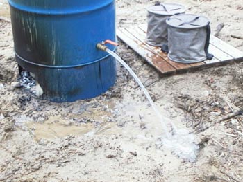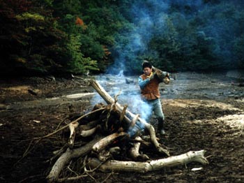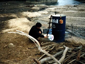 後から来たイカちゃんも加わりいよいよ、ドラム缶風呂入浴に向け、たきぎ工場が始動した まずは焚き火だ!!そしてバケツリレーでドラム缶に水を入れていく・・ 焚き火の火種をドラム缶のかまどに点火!!さながらシドニーオリンピックの開会式のようだ |