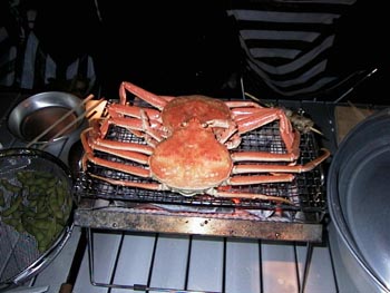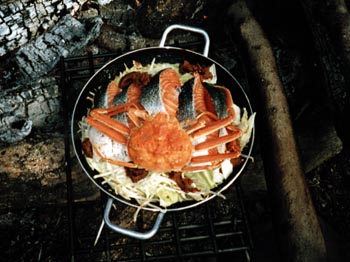 今回購入したキノコは、マイタケ、ヒラタケ、1本シメジ、ハスタケ、ナメコ、ナラブサと種類も豊富 それにスーパーで買ってきた、シイタケ、ブナタケ、雪国マイタケも加わり更に豪華になった!! かまどに火を入れてから2時間、辺りは暗くなり始めているが、一向に温度が上がらない?? 水温と気温が低いからだろうか?仕方なく夜の宴会に突入していく・・・ 最初はタラバガニが登場した!! |