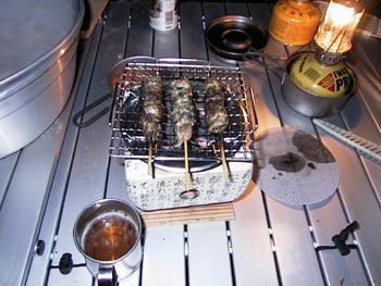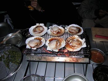 | 飛騨コンロで焼き鳥を焼く者あり、ホタテを焼き始める者あり・・・・ |