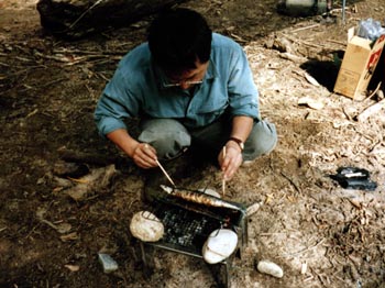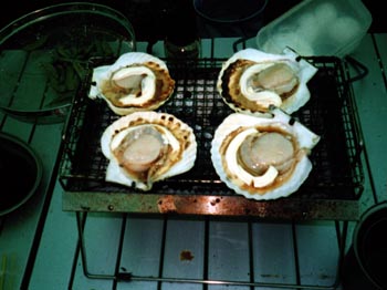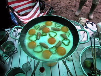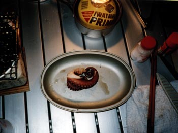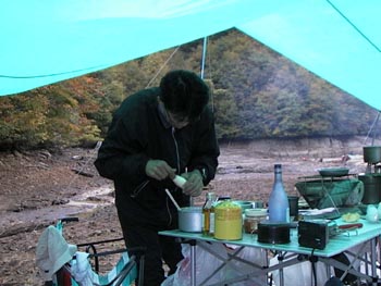 テントを打つ雨の音で目が覚めた、昨日から降り出した雨は翌朝まで降り続いていた 6時を過ぎると次々と他のメンバーもテントから這い出してきた・・・ 夕べのお風呂のせいか、キャンプ2日目だと言うのにみんな爽やかな顔で脂ぎっていない!! イカちゃんがまた朝から海の幸を披露!バイ貝の煮付け・・・「ウーン珍味!」 |