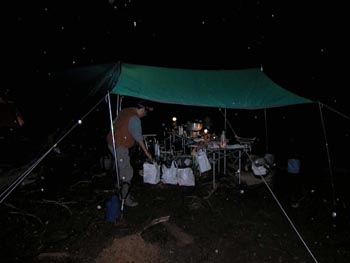 キノコ鍋も出来上がり、ビール、日本酒、焼酎とアルコールの摂取量も増えていく・・・ 雨がポツリポツリと降り出し、辺りが闇に覆われ始めた頃ようやくドラム缶から湯気が出始めた |