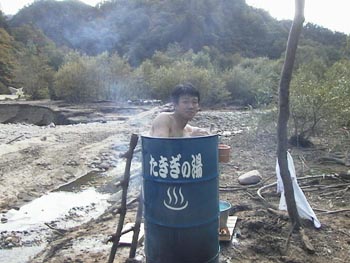 岡部さんが到着する頃には雲の間から太陽も顔を出し、まだ紅葉の早い山を映し出す 「どうやって持ってきたんですか?」と、不思議がる岡部さんに、僕がドラム缶に入って 佐渡の小木のタライ船のように漕いできた、と言うことにして、いざ、たきぎの湯へ 他のメンバーは今回2度目の入浴である |