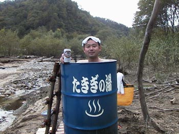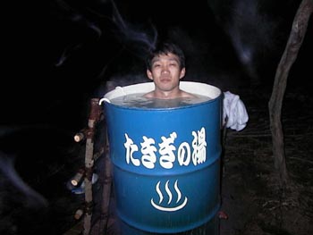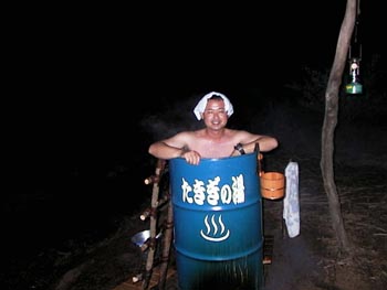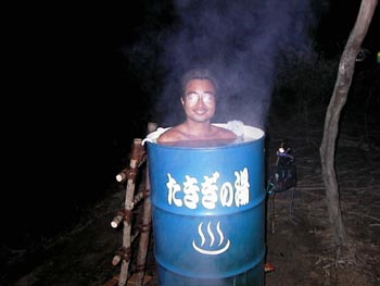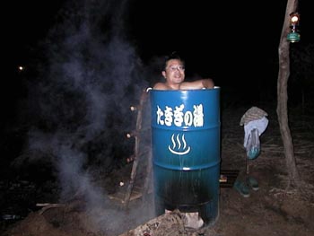 今回、このドラム缶風呂の制作者である、サメカジ寒河江が1番風呂に入る!!「ウーン天国」 続いて発熱体飯田も「極楽、極楽・・ここは奥利根だよね・・・・」と大満足! |