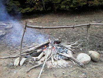 更にカニの王様、毛ガニまで飛び出す始末!! 昼頃来ると言っていた「お〇べ星人」こと岡部さんを出迎えるため、再び焚き火を起こし ドラム缶のかまどに火を入れる |