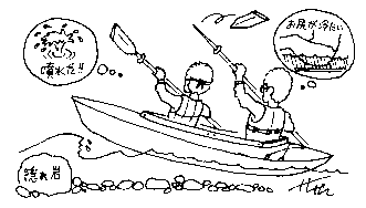 この2人は川下りの経験が乏しく、コース取りが悪くて、隠れ岩を目掛けて?瀬に突入して行ってしまうので、早くも船体布に数カ所の穴を開けてしまい、浸水を始めているようだ。
