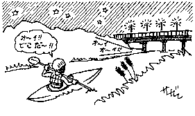 寒空に輝く星を眺めながら、カヌーを漕げる喜びもあるが、どこかもの悲しい。などと、感傷に浸っていた大松さんは、ちょっとした瀬の隠れ岩に乗り上げ、あえなく沈脱!! 「もう、沈脱をしないぞ!!」と、心に決めていた横田さんも、すでに2度目の沈脱をしていた!!
