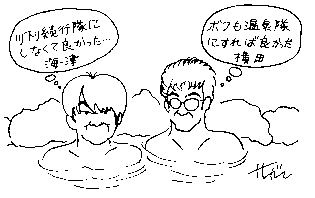 「ここであがって正解だよ、先に行った連中は地獄だ」などと、温泉隊はくつろぎ始めていた。