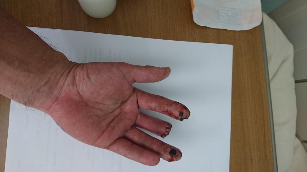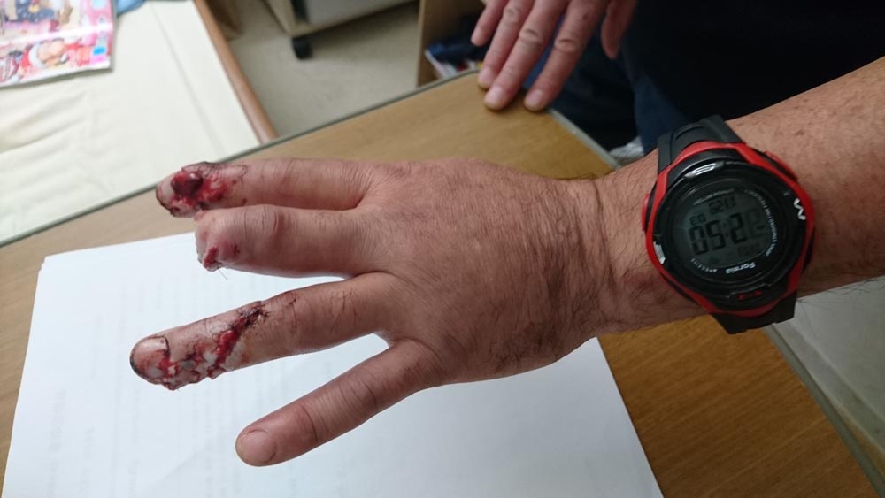 左示指末節骨開放骨折、左中指不全切断、左環指不全切断