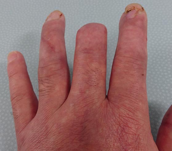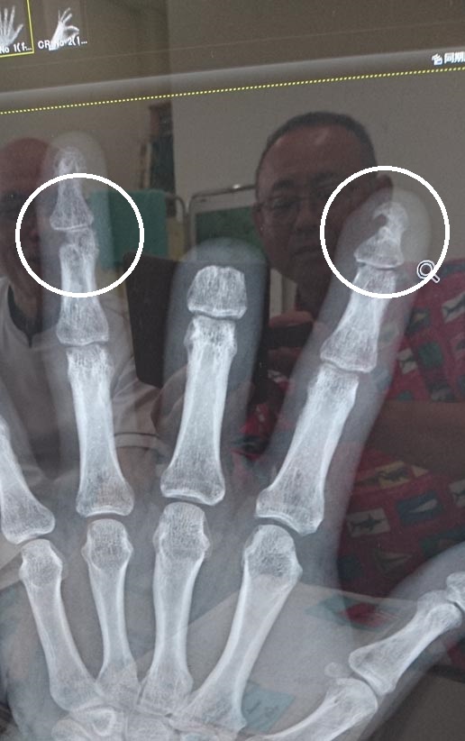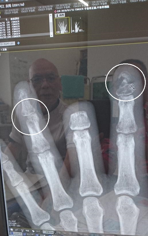 診察で院長先生と手術後の画像をパソコンの画面で比較して 骨の付き具合を確認する 左手人差し指・示指末節骨骨折、中指・不全切断(欠損) 薬指・第1間接環指不全切断 |