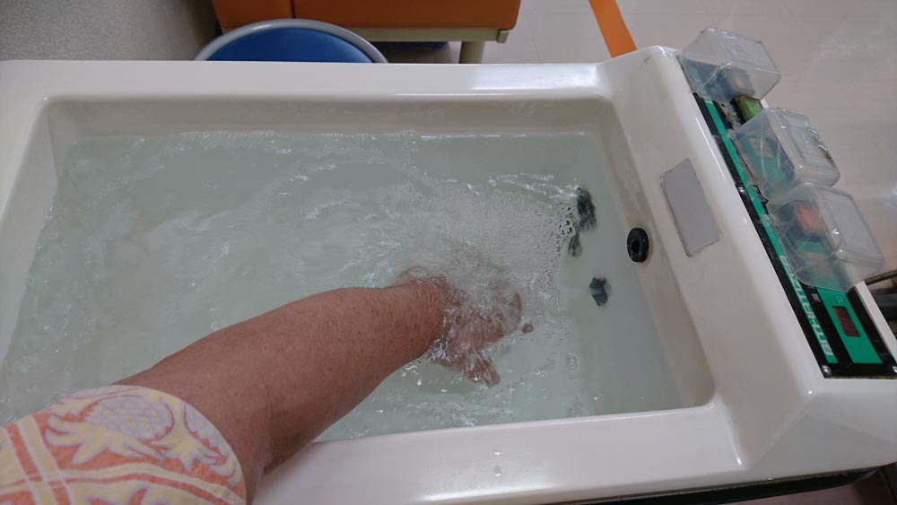 ミニジェットバスみたいな過流浴で温める その後は曲げたり伸ばしたり引っ張ったり、 地獄のリハビリが始まる |
