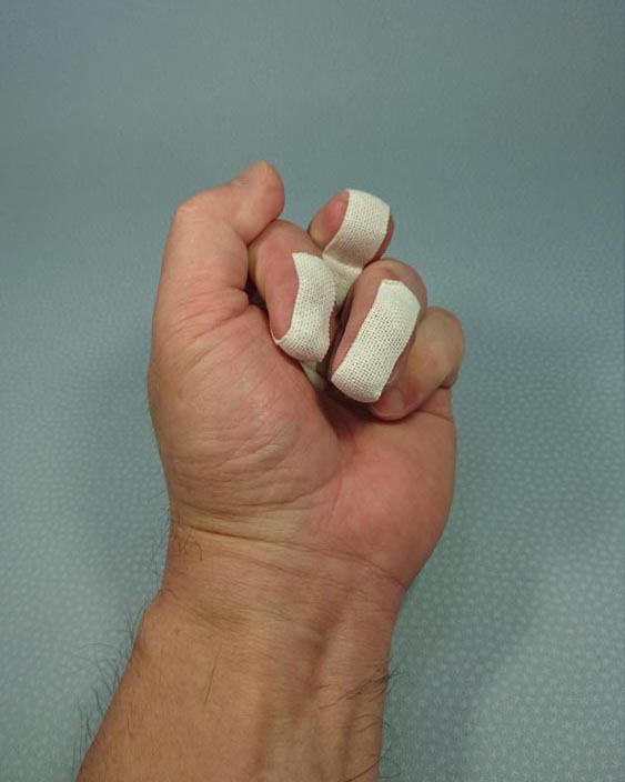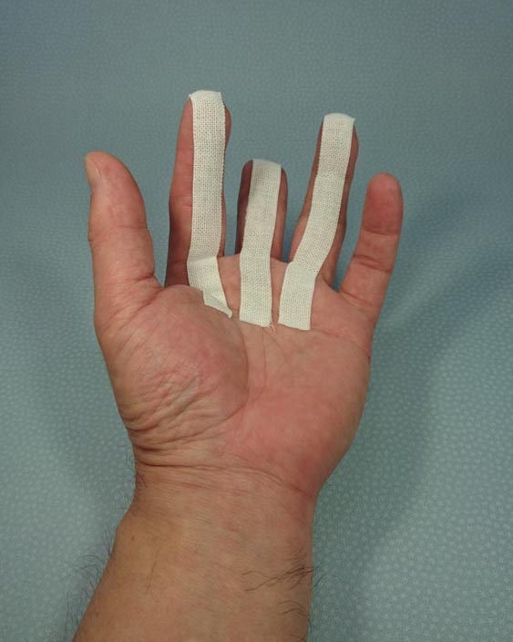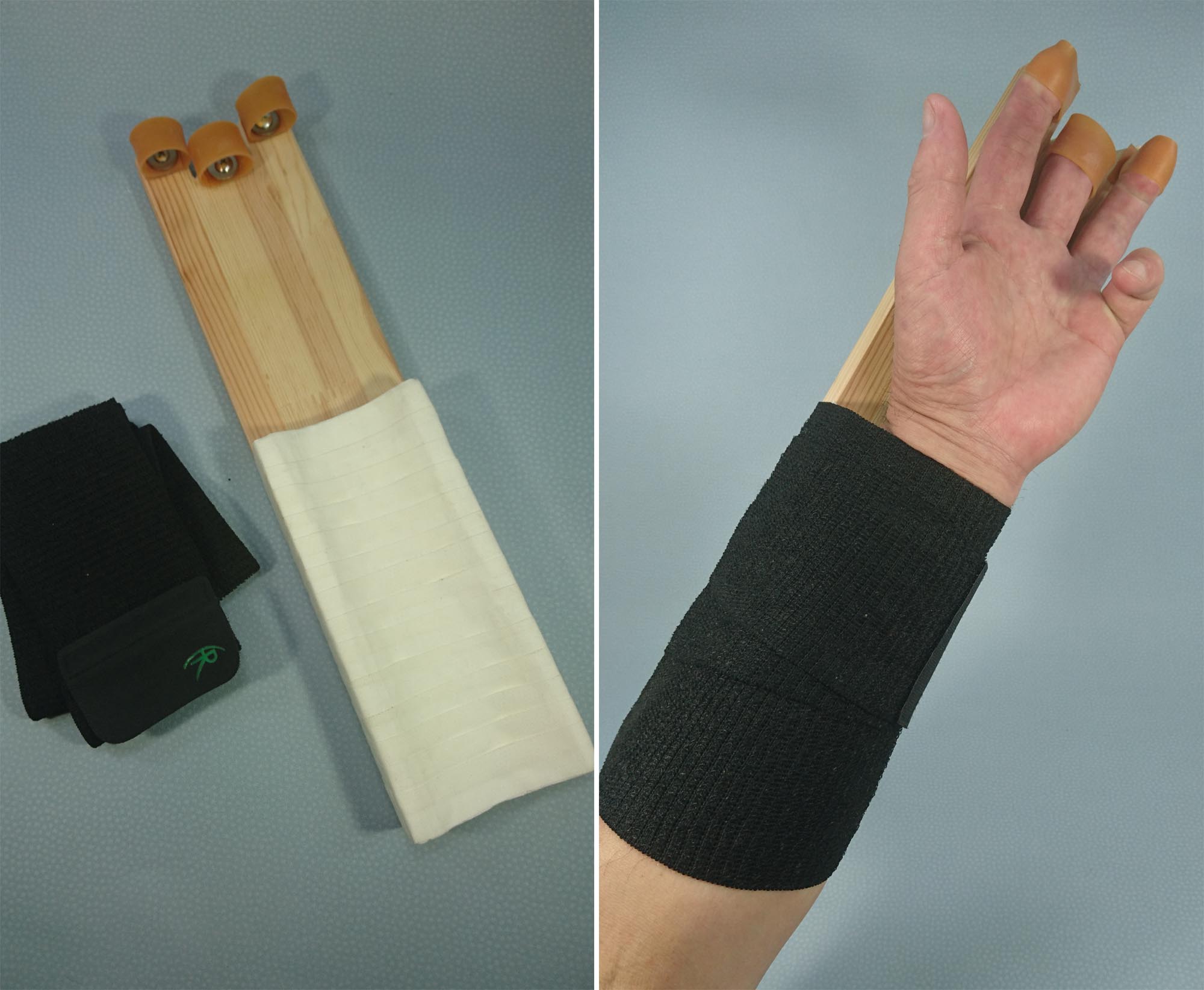テープで切れた腱を補う様にして、 指をだまして動かす |