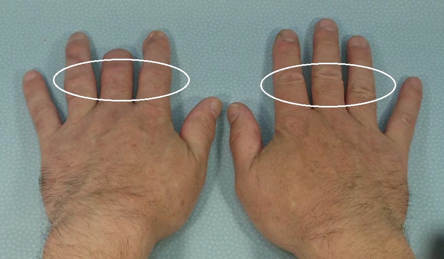 「指を伸ばした時に関節の所に、しわが出来てこな いと、痛みやしびれは取れてこないよ」 |